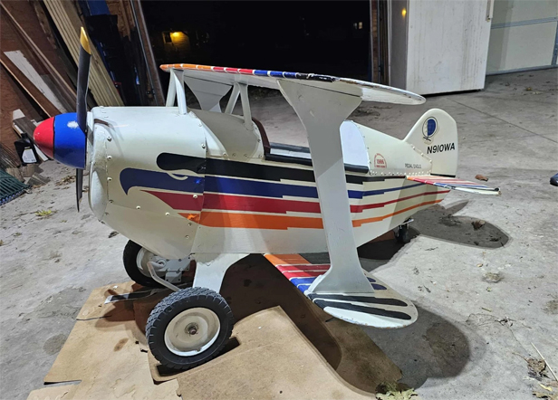 The Vintage Pedal Plane is a collectible aviation product modeled after the Pitts Eagle from 1986. This pedal plane, made in the United States, is a unique piece for aviation enthusiasts and collectors. Perfect for display or even for a nostalgic ride, this pedal plane captures the essence of vintage aviation aesthetics and craftsmanship… This hand built wooden pedal plane is 40 years old. It was built in 1986 (estimated). It was used by a family of 3 children and shows an appropriate amount of wear for it’s age.